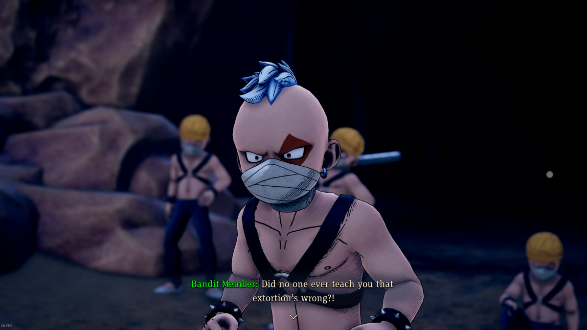 Upon talking with Uzume, she will explain the situation with the inherited debt and ask you to get her sister Terasu back from their debtors, the Diamonds gang. They’re not far, a short journey northeast of your location, standing at the mouth of a cave. Approach them to initiate a conversation. After Beelzebub and the bandit leader finish debating the finer points of contractual labor, you’ll be given a choice: offer to save up and pay off the girls’ original debt yourself or refuse.