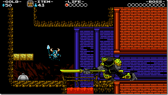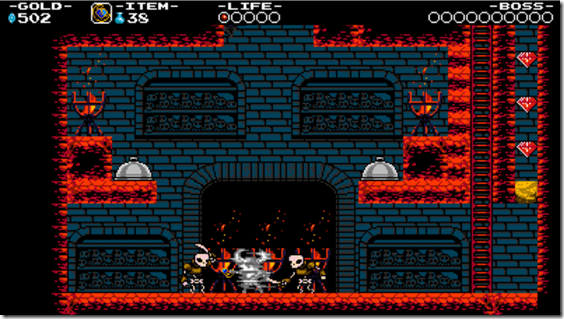 For me, a player lacking in genre experience and reflexes, this generosity is not just time saving, but it saves the entire experience. If I had to go back to the beginning of a level every three or five or even ten deaths it would not have enhanced my experience or taught me how they played games in the “good old days”—it would have upset me and probably led to me never beating that darn snow level at all. Players who want more punishment can destroy the checkpoints for money. Why anyone would do that is beyond me, though. I don’t much care for Shovel Knight’s tone. It seems like it’s gunning for comedy, but the comedy never really extends beyond the initial joke in the title. A knight is fighting to save the world/the girl with a shovel! That’s kind of goofy, but when the game so frequently goes back to it, it also eliminates any dramatic potential. Maybe this is just me, but I was ready to accept that this is a world where shovels are valid weapons and move on to the meat of the experience from there. There are some limited conversations with named characters and some dream sequences that suggest that this could have been a cast of characters and a world to care about. You know, in that old-school way where there’s not much dialogue or graphical flair so the game suggests a wider world and your imagination fills in the blanks to make it an interesting and wonderful place. But when Shovel Knight felt the need to deal out some “Shovel Justice” or otherwise get smart that imaginary universe is contradicted and replaced with lame shovel jokes that read like they were written to play well on forums. Shovel Knight is not an extraordinarily long game, but it’s not short either. Something about linear 2D side-scrolling level design seems to put a hard cap on the amount of content in a game. The game is an 8+ hour experience for me, but skillful players may burn through it faster. Suffice it to say that Shovel Knight has as much content as the games that inspired it, plus a few extra bits of optional content scattered around. This is one area where I wish the game had strayed from old school design. More levels, please!