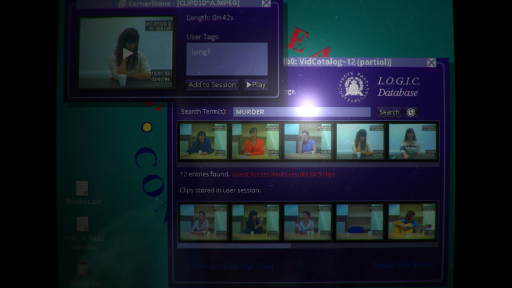 Sam Barlow was previously the writer and designer of Silent Hill: Origins and Silent Hill: Shattered Memories. Now, he’s working on his own solo projects, the first of which is a crime thriller called Her Story. Her Story turns your computer or iOS device into a police computer terminal. You’re able to type in search terms to bring up clips from live-action videos relevant to those search terms. Not just any clips, the videos are all archive footage of a British woman being interviewed by police in 1994 about her missing husband. The woman is played by musician and actress Viva Seifert, and the footage is made to look like you’re watching it on low-quality VHS technology, giving it quite an authentic look.