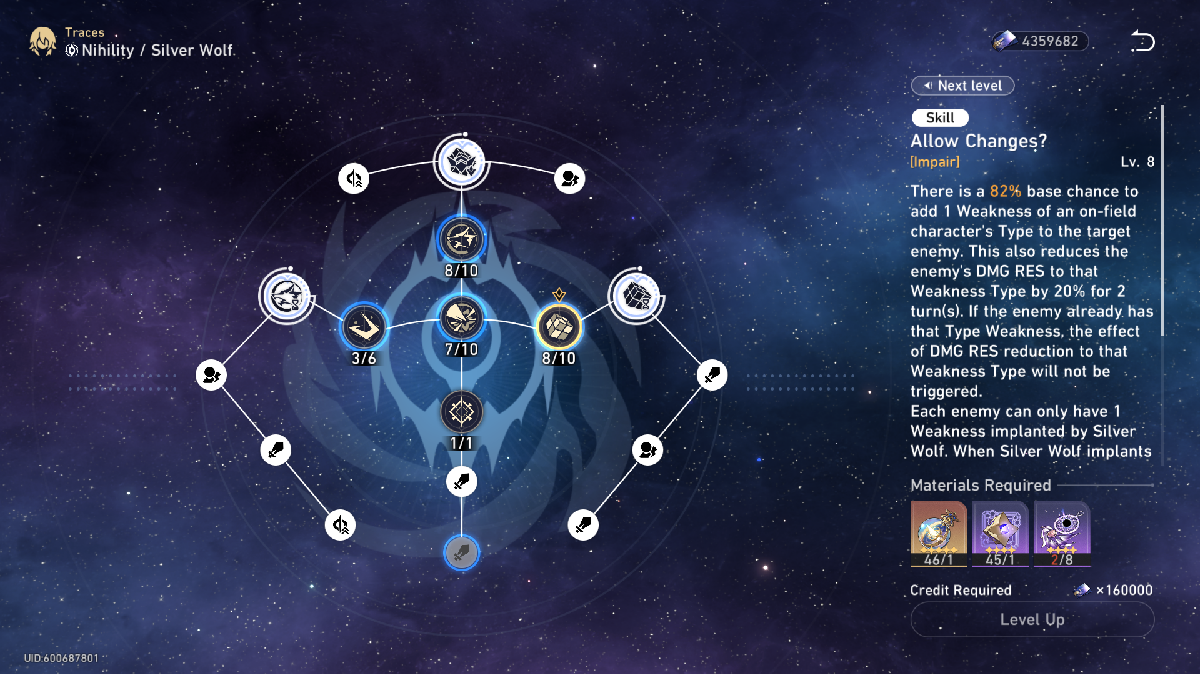 Another reason is because of Silver Wolf’s ability as a supporter. So far the only other Nihility character who specifically focuses debuffing the enemy, rather than inflicting a Break Effect or DoT, is Pela. However, Pela can only lower the enemy’s DEF. In contrast, Silver Wolf has the chance to lower three different stats. Granted, the debuff is quite slight, even after leveling up Traces. Her Skill also makes it easier for other characters to Break enemies, as well as gives more options depending on what kind of Break Effect you want.