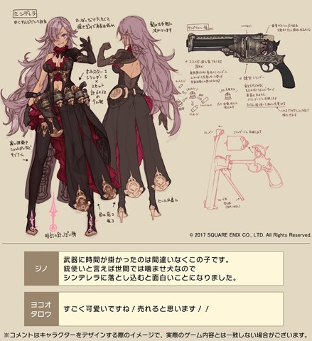 We previously got to see design work for Alice, Snow White, Akazukin, and Ibara Hime for Yoko Taro’s upcoming smartphone game SINoALICE, and the official Twitter account has shared a look at its next wave of characters. As seen previously, the designs feature comments from creative director Yoko Taro and character designer Gino. Cinderella (CV: Eri Kitamura)