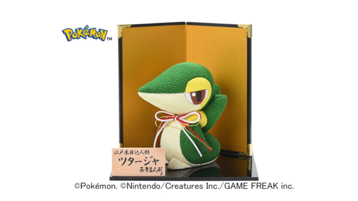 This Snivy is not the first Pokemon Kimekomi doll from Mataro Doll. It previously released dolls like Eevee and Dratini. Close-ups of the Snivy doll reveal the details that went into crafting it. It comes with a ribbon around its neck, as well as a traditional Japanese stand for displaying.