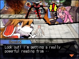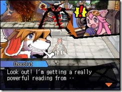 What’s up Chocolat? Well, we have a bunch of screenshots from Solatorobo: Red the Hunter from Nintendo of Europe. This first group shows Red, the titular dog-human hybrid hero, running into a Shade. Chocolat who appears in dialogue bubbles is Red’s younger sister.