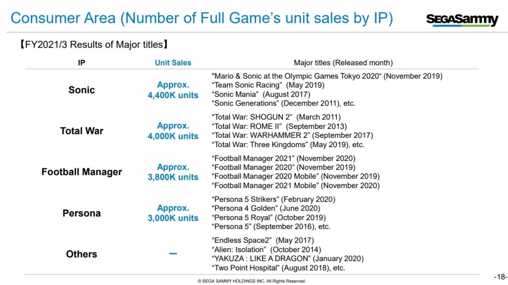 Major earners for Sega Sammy throughout 2020 included its mainstay franchises. These included Total War, Persona, and Sonic the Hedgehog. Sonic titles broke 4.4 million units sold. Persona games sales broke 3 million units, thanks to the releases of Persona 5 Royal, Persona 5 Strikers, and even the PC version of Persona 4 Golden. Another spotlight franchise was Total War. The series proved its longevity through strong sales of titles released in 2019 like Total War: Three Kingdoms and Total War: Warhammer 2. Sports fans continued to support Football Manager. Both the mainline Football Manager 2021 title and the mobile editions helping the franchise surmount the 3.8 million unit milestone. The rest were made up by more isolated titles and somewhat less numerous franchises like Yakuza, Two Point Hospital, and Endless Space. In the current fiscal year that began in April 2021, the company expects earnings to recover in its physical sectors. It’s also anticipating further returns from new consumer games, including the releases of announced titles. That includes Total War: Warhammer III, Lost Judgment, and Shin Megami Tensei V. Sega Sammy’s full public presentation is available online.