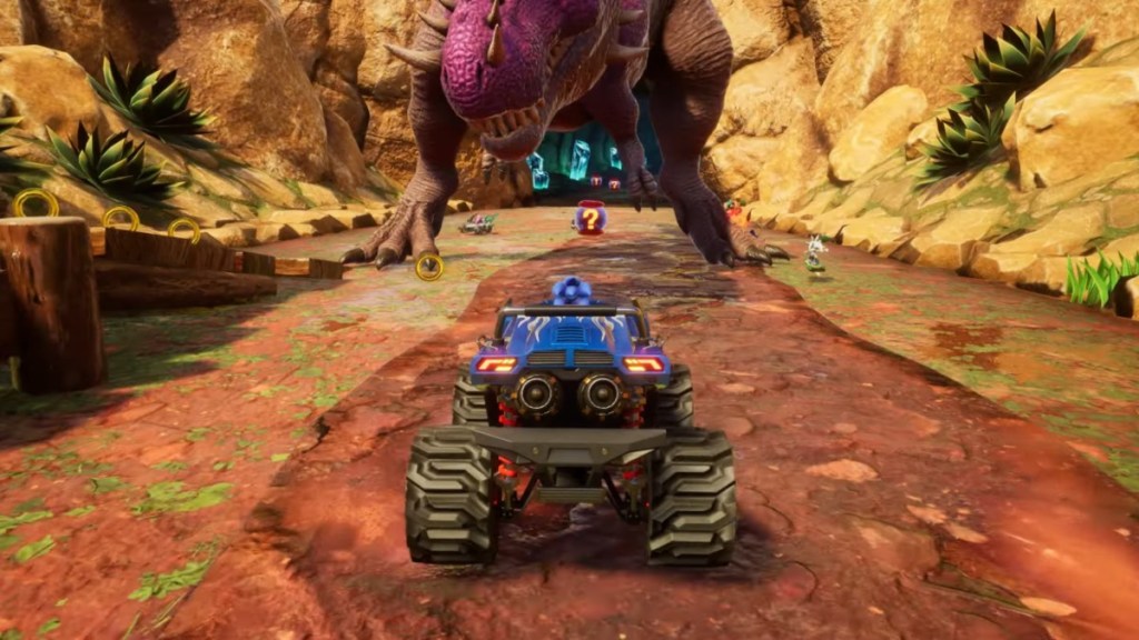 The Transform feature from Sonic & Sega: All-Stars Racing also returns, automatically transforming vehicles across different terrains. During one segment of the trailer, Sonic can be spotted transforming his sports car into a rugged monster truck while driving between the legs of a dinosaur from Sonic and the Secret Rings. You know, the usual.