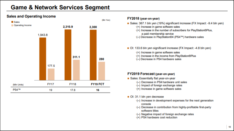 Sony has revealed its financial earnings for Fiscal Year 2018, and they have reported that there was a decline in PlayStation 4 hardware sales this Fiscal Year, while software has increased. That said, this isn’t bad news for Sony, as the latter was able to cover up the lower hardware sales, as overall sales still increased 19% year-on-year, from 1,943.8 million units sold to 2,310.9 units sold. To put this total sales number into context, this doubled the revenue of the gaming division in 2013 when the PlayStation 4 first came out, and the profit from this year alone for PS4 surpassed the entire profit made with the PS2 comparatively during its six years. Sony predicts that the same will happen for Fiscal Year 2019, although in terms of operating income, a decrease is expected thanks to less heavy hitter first-party titles, such as God of War and other titles, as well as an increase in development costs for their next console.