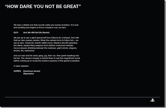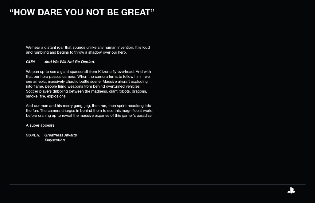 Sony is going to give PlayStation 4 a big marketing push and the keywords behind it are "Greatness Awaits." Siliconera obtained a leak from a company working on the campaign. The commercial starts off by showing an empty road in a small town. A lone guy walks down the road towards the camera and says, "Who are you not to be great? You, with the imagination of a brilliant child and the powers of an ancient god."