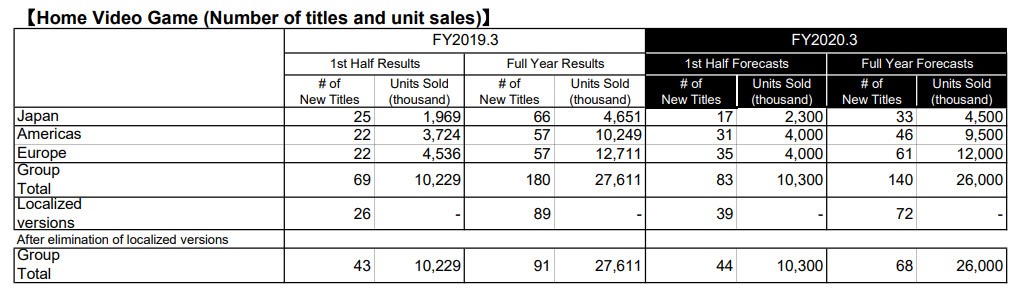 Here we have a breakdown of home video game titles and unit sales across Japan, the Americas, and Europe. It shows that Europe continues to lead all regions when it comes to software sales and Japan saw the fewest. What’s interesting here is that it shows that a total of 69 new titles released in the first half of the previous fiscal year and when all was said and done the company released a total of 180 new titles in the fiscal year ended March 2019. The forecast for the current fiscal year shows 83 titles for the first half but the full-year forecast is down to 140, so that means expect a heavy first half and a slower second half with much fewer titles going into the third quarter from Bandai Namco.
