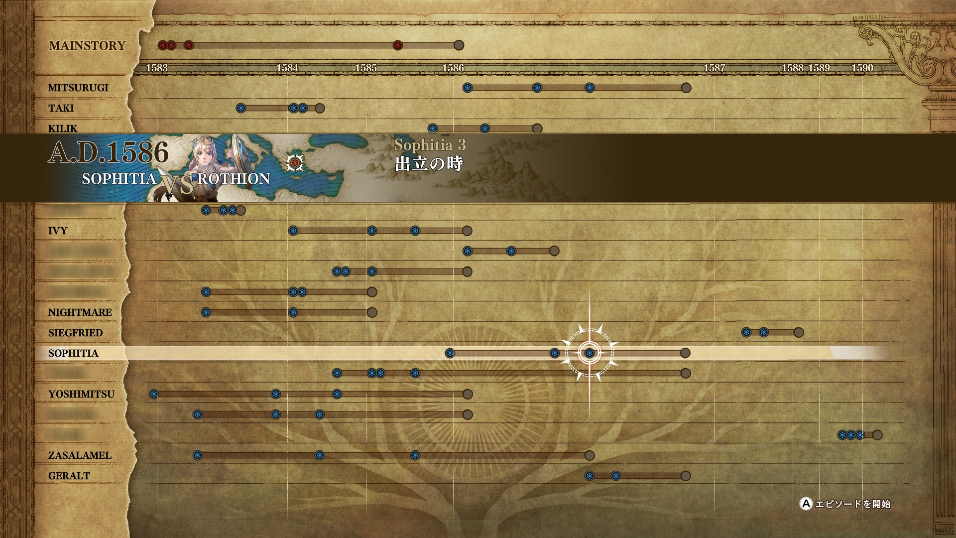 Players will get to experience the story that takes place from year 1583 to 1590. The chronological menu has the main story along with character episodes mixed in as shown in the above screenshot. Each time you clear something a new episode unlocks.