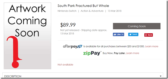 South Park: The Fractured But Whole recently was listed on an Australian retailer’s website for the Nintendo Switch. While there was no provided box artwork, the game is listed on the site as a March 13, 2018 release date. Thanks, [notjona from Reddit]
