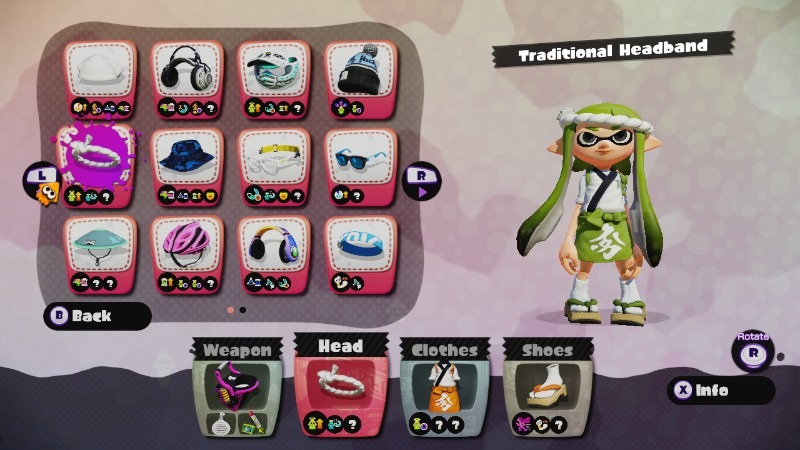 The Famitsu Splatoon shoes are quickly outclassed, since the starting Run Speed Up ability isn’t very viable compared to three-star shoes found eventually in the game. However, the two starting abilities for the Traditional Apron and Headband coordinate well for beginners.