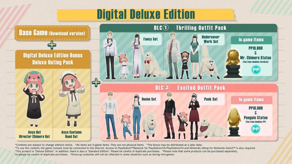 Two of the pieces of DLC are the Spy x Anya add-ons anyone can purchase separately. The Thrilling Outfit Pack includes two sets of clothing for Loid, Yor, Anya, and Bond. One is the Fancy Set of formal clothes, while the other is the Undercover Work Set that shows the clothing the characters wear at their jobs. It also gives people 10,000PP to spend and a Mr. Chimera Statue that doubles the amount of Eurekas earned. The Excited Outfit Pack involves more everyday clothing. The Denim Set gives Yor and Anya overalls, Loid jeans, and a t-shirt, and Bond a denim bow. The Punk Set involves black leather jackets, red plaid bottoms, and black boots for everyone. That pack also gives people another 10,000PP and a Penguin Statue that doubles earned PP.