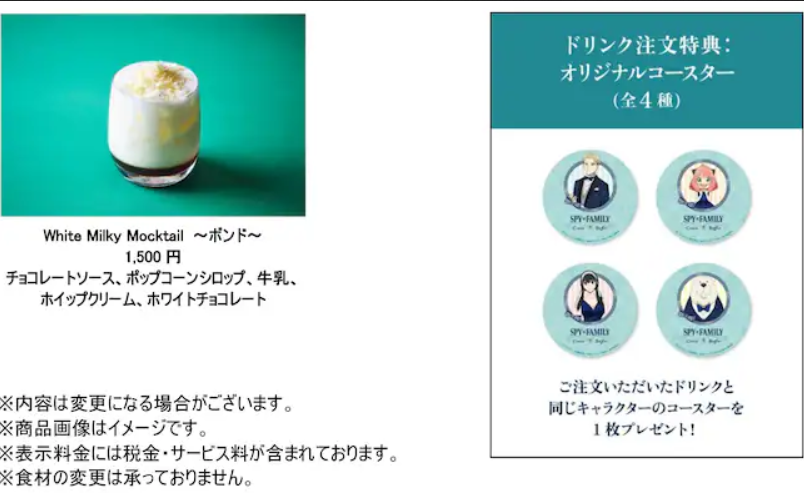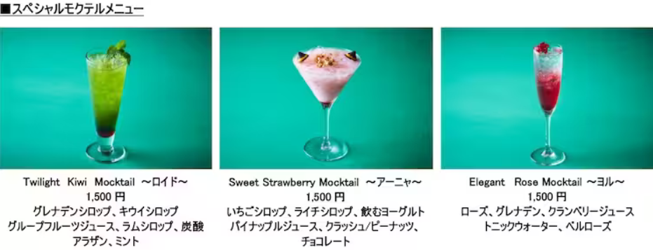 Aside from sweets that were made with the characters in mind, there is also a cake in the shape of Eden Academy’s hat, as well as macarons that look like the Stella Stars and Tonitrus Bolts. There are also non-alcoholic beverages that you can order, which are character-themed. For example, Yor’s mocktail has rose, grenadine, cranberry juice, and tonic water. Its red color is to indicate her true identity as an assassin. When you order a drink, you also get a random coaster. Each mocktail costs 1500 JPY.