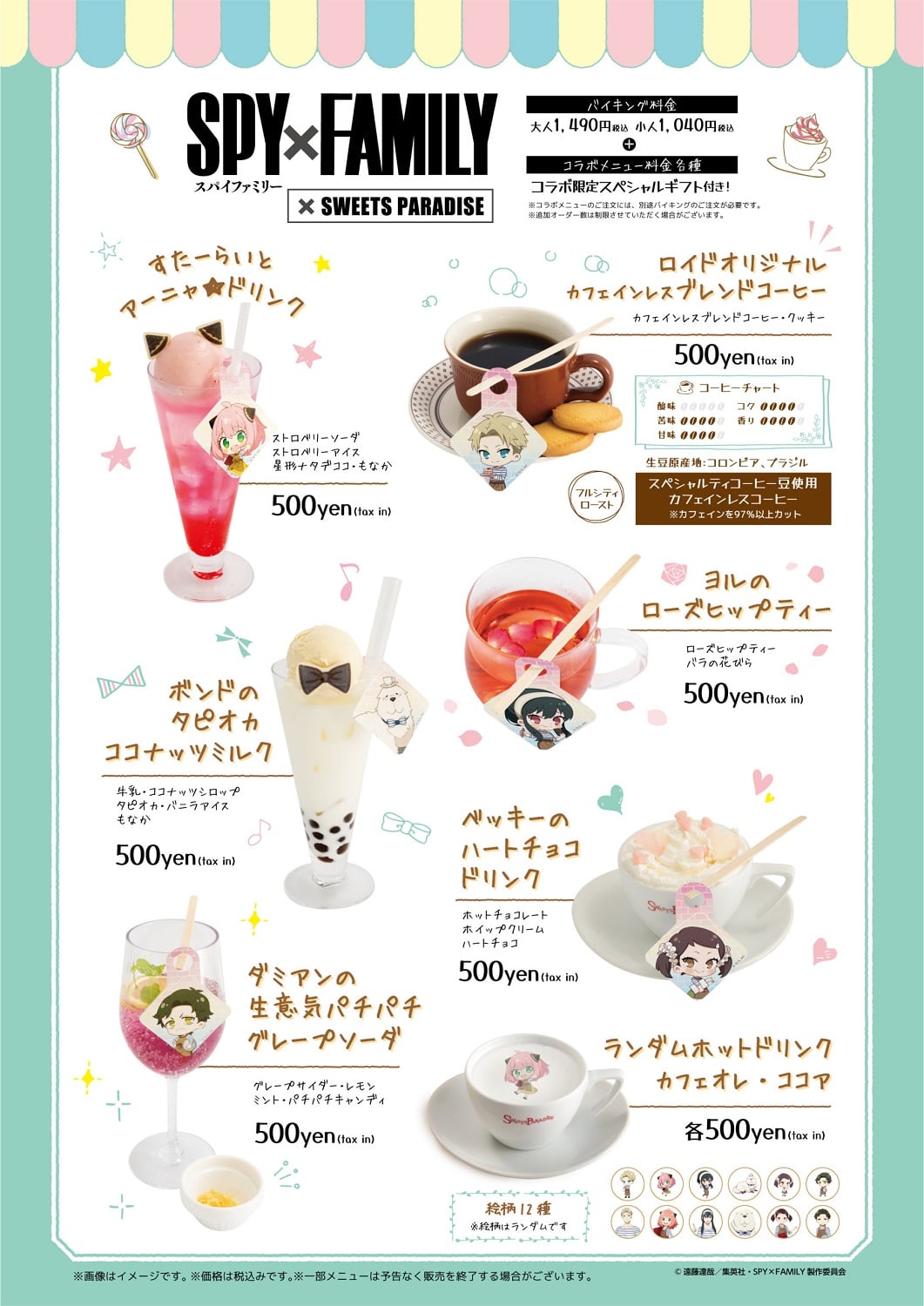 Sweet Paradise in Japan announced that it will offer a limited-time collaboration with Spy x Family. Visitors will be able to eat snacks and enjoy drinks based on their favorite characters from November 12 to December 15, 2022. There will also be exclusive merchandise to purchase. Ordering something will garner you a free coaster. [Thanks, Famitsu!] The key visual for the Spy x Family Sweets Paradise collaboration features the Forger family (including Bond), Becky, and Damian. As for the menu items and their prices, they are: