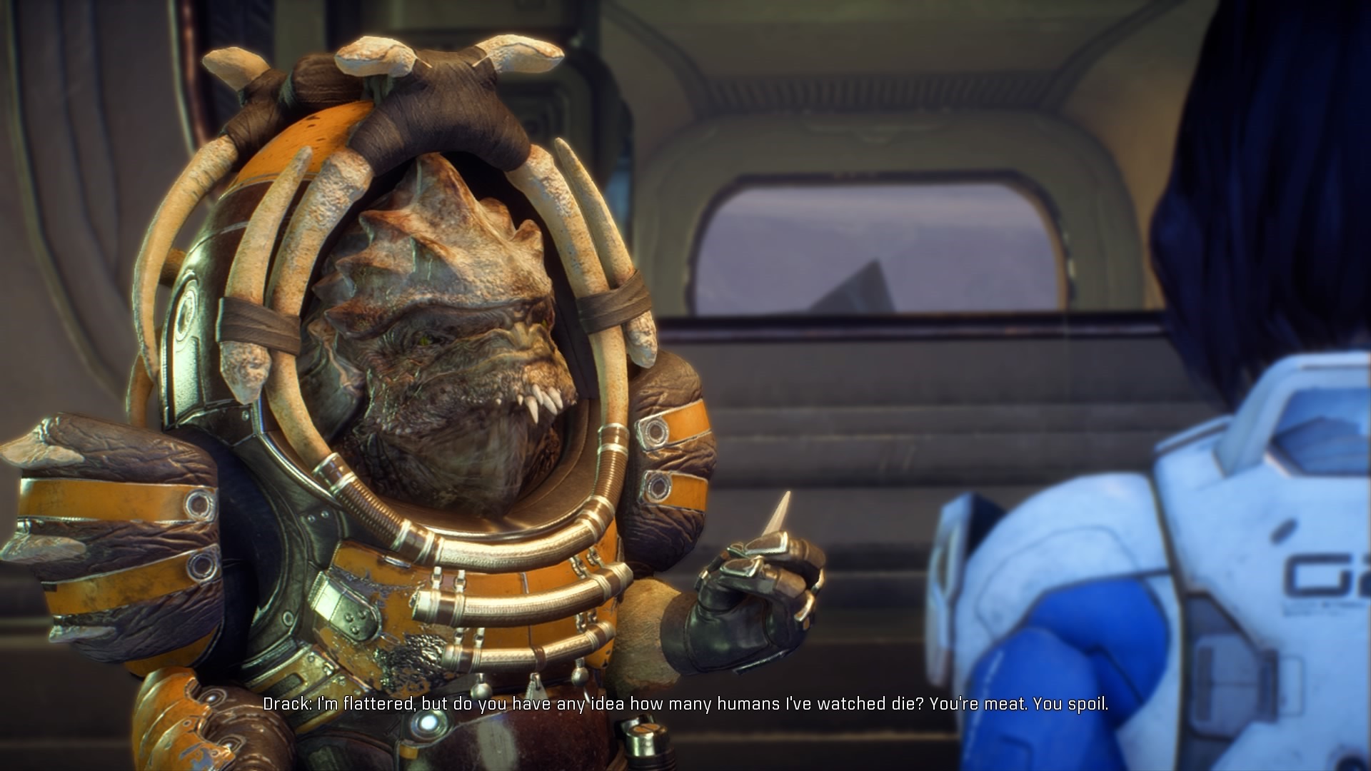 And then there’s Drack. Drack is great. Drack is the team dad. He’s this tough, gruff, hilarious old man who’s probably tougher than you’ll ever hope to be. He’ll tease you like crazy, but only because he does like you. When he finds out you lost your dad, he’ll send you tons of pictures of guns (many watermarked) to try and make you feel better. He tries in the best way he knows how, which usually is the best possible way ever. Guns? Sure. Violence? Absolutely. Sarcasm? Always. For one of the scariest aliens in the universe, the interactions with him are some of the most charming and approachable.