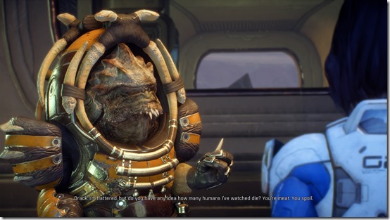 Jaal is another alien that’s wonderful. Perhaps its because he’s the only new race, which means this is the first all “new” person to us. He starts out as this wary individual who’s absolutely willing to use Ryder for his means while letting the Pathfinder take advantage of the boons that come from having an Angara on the team. But gradually, he opens up. He begins making gifts for his new teammates. He even goes from being a casual acquaintance option to a friend and romance option for a female Ryder. I suppose the only thing that bothered me is that Mass Effect: Andromeda makes this big deal of saying Angara are an emotional race, but we don’t often get that from Jaal aside from occasional snippets.