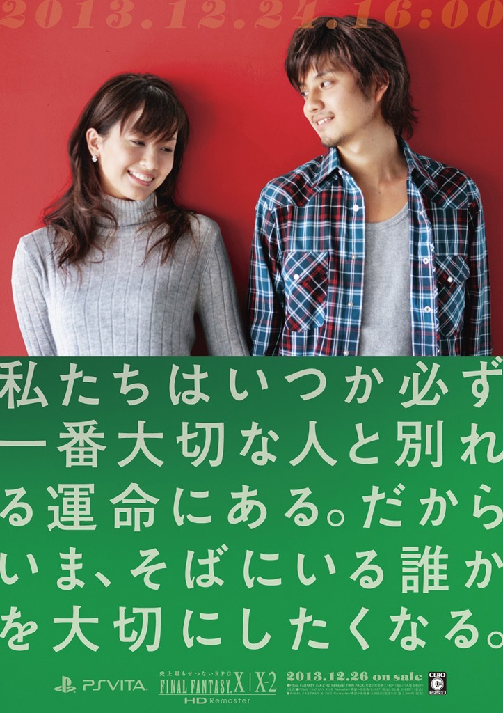 The idea behind the bittersweet melancholic poster message is to provoke thoughts of “a parting that cannot be fought against” and to appreciate your significant other while you can, similar the story between Yuna and Tidus in Final Fantasy X. …which is also the message behind the tear-jearking commercial for Final Fantasy X/X-2 HD Remaster in Japan.