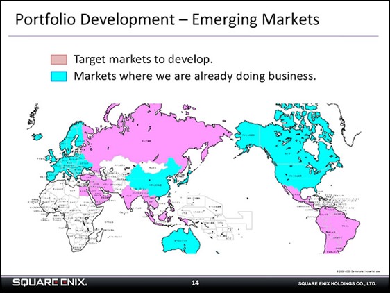 In a recent financial results briefing, Square Enix vaguely touched upon plans to expand into emerging markets in the future. The company pointed out that consoles are becoming more common in the Middle East and Central/South America, which might represent an opportunity. In addition to the aforementioned territories, Brazil and Russia are two others Square Enix are taking an interest in. Russia in particular is considered a challenging market to break into, Square said, although the region thrives on free-to-play and online games, which will be the key to breaking in. “[Russia and Brazil] are also home to many talented developers, which are justifications to consider Russia in many options, including sourcing for development studios,” company president Yosuke Matsuda said. “In brief, the Company is expected to reach out to wider regions in its efforts to expand the business outside of the domestic market.” Image source: Square Enix.