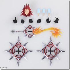 Axel coat also uses soft plastic that doesn’t affect poseability, and he comes with his chakrams, plus his keyblade. While he only has one face part, he has six hand parts and also comes with three sticks of sea salt ice cream that you can make him hold.