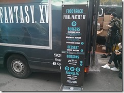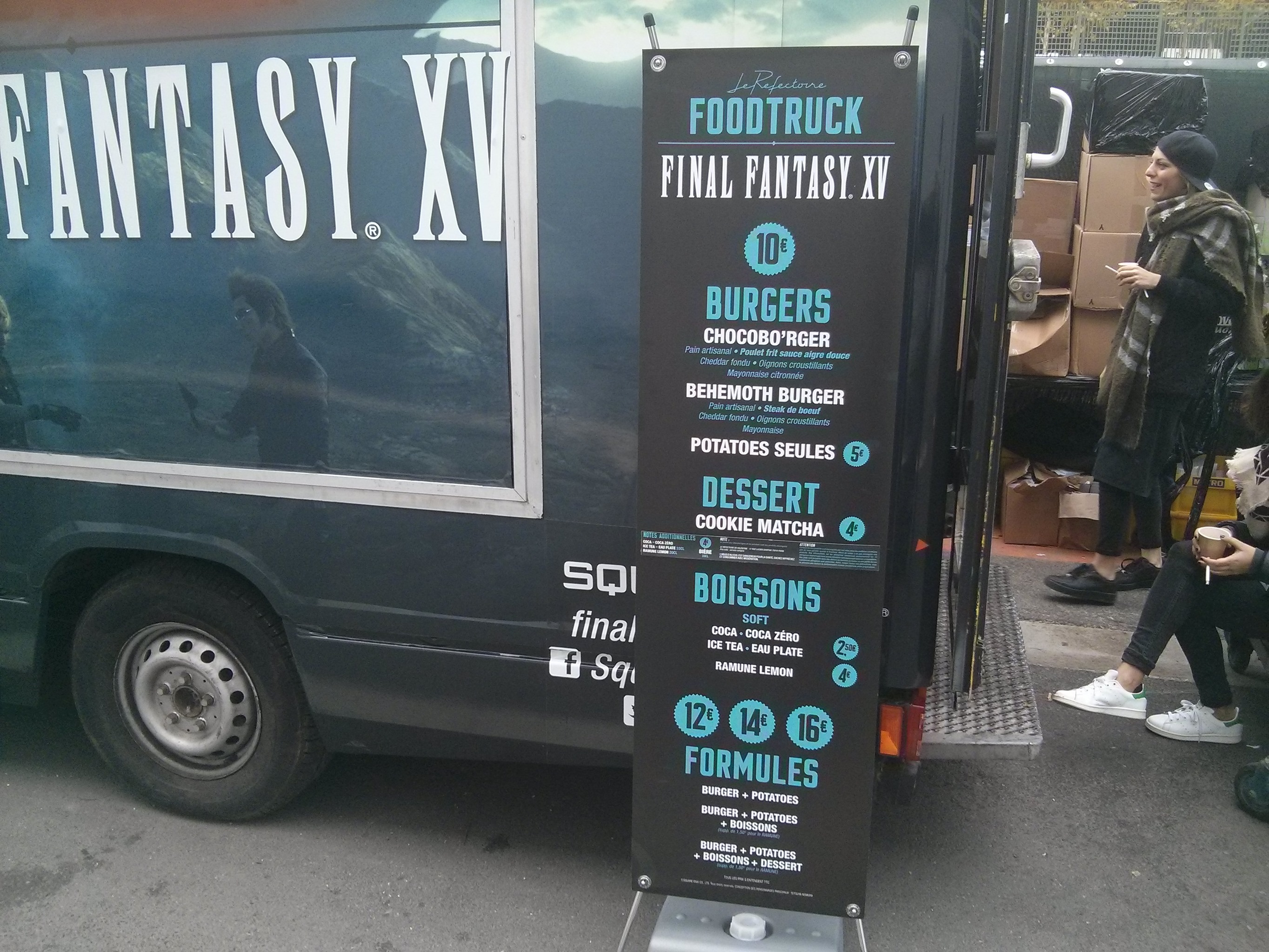 People attending Paris Games Week had the unique chance of getting to try Final Fantasy XV burgers. [Thanks, Dualshockers.] Yes, you read that correctly. An official Square Enix food truck was present at the event, offering burgers in Chocobo (chicken) and Behemoth (beef) flavors. The food also came with branded napkins, bags, and postcards featuring the latest official artwork from the game. You can check out some pictures of the burgers as well as the Final Fantasy XV food truck below.