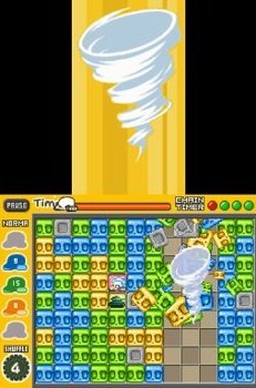 Aside from the colored, tank-faced blocks on the touch screen, there are also power up blocks. A Baby Tank turns a line of adjacent blocks all one color. A block that has shifting tank-faces will eliminate blocks that are all the same color as the one when you tap it. Tapping a normal Tank will summon a tank to wipe out two horizontal rows of blocks, while tapping a tornado will wipe out three vertical rows of blocks. Finally, there’s a shot to summon the girl tank Nurse Jane, who will refill the timer for the level you’re on.