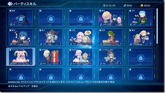 Item Creation: While visiting Welch at Medock, you can learn about Item Creation in order to acquire various party skills. Item Creation is split into three different parts of “Recipe Synthesis,” “Creative Synthesis,” and “Equipment Upgrade.” The creations can be done anywhere. Recipe Synthesis: