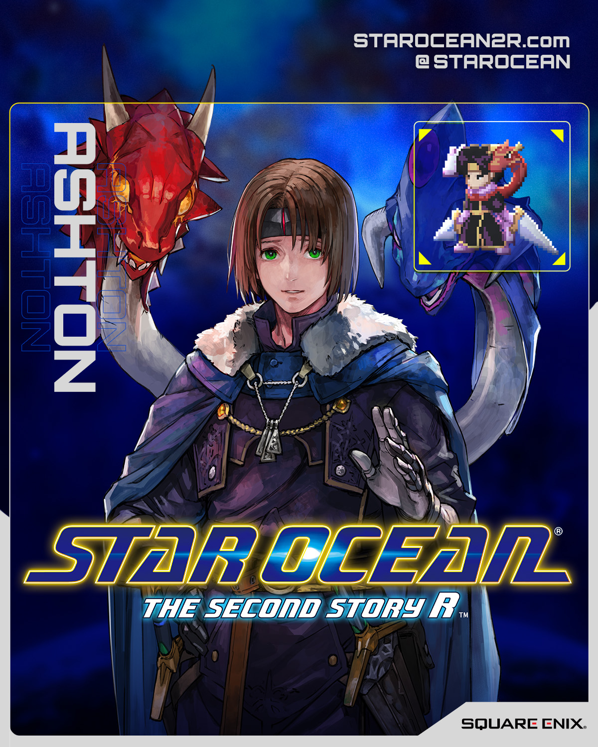 Square Enix has been going over Star Ocean: The Second Story R characters and, in so doing, shared Ashton Anchors, Celine Jules, and Dias Flac brief profiles and art. These are static images that show their new portraits and an example of how their sprites look. First, here’s how Ashton will look in Star Ocean: The Second Story R, based on Square Enix’s initial tweet. Due to an incident not long after Claude and Rena meet him, a two-headed dragon he was fighting ends up fused onto him. The dragons were called Creepy and Weepy in the original game, though its unknown if that could change in the updated one. )