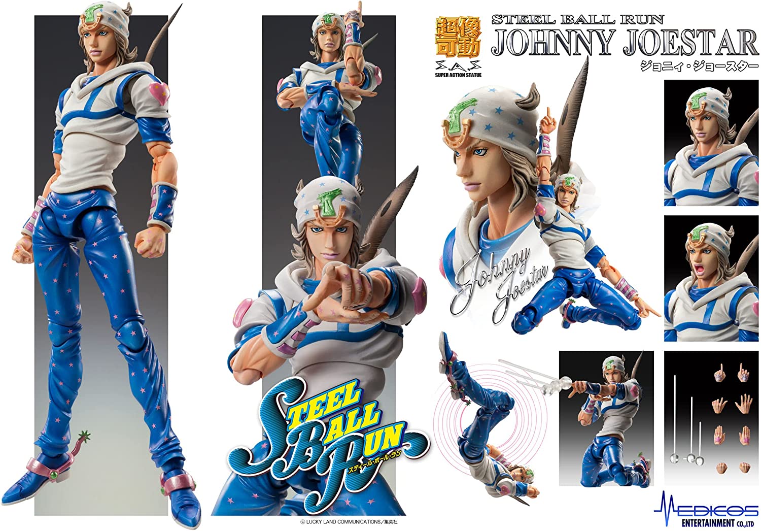 A JoJo’s Bizarre Adventure: Steel Ball Run Johnny Joestar figure will appear again. It turns out the Super Action Statue version is getting rereleased. It first appeared in 2018, when standard and Wonder Festival 2018 [Winter] versions appeared. Now in August 2023, it will appear in Japan again. It is showing up for ¥8,251 (~$61.71) on Amazon and $66.65 on Hobby Link Japan. [Thanks, Dengeki Hobby Web!] The rerelease is identical to the original version of Johnny Joestar. While it the line features “statue” in the name, it is an articulated figure. There are two face plates, with one smiling expression and another looking angry. People also get multiple pairs of hands. Additional action parts make it look like he is using his Stand, Tusk. He stands at 150mm tall, which makes him just under six inches. Here’s a closer look at the Steel Ball Run Johnny Joestar Super Action Statue figure.