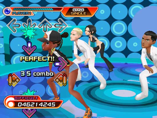 Besides adding new songs and online play, the last “revolution” Dance Dance Revolution had was freeze arrows. That was way back in Dance Dance Revolution MAX and most fans have mastered standing still on an arrow by now. Dance Dance Revolution: Hottest Party throws veterans a curve ball, it adds in new arrows. The first twist is hand movements with the remote and nunchuck. Replacing the usual green arrows are orange diamonds that instruct you to shake the remote. When an orange diamond crawls to the top of the screen over the left arrow you need to shake the nunchuck. If it’s on the right hand side you shake the remote. If you’re a DDR purist you can turn the shaking off, but the extra motions are part of what makes Dance Dance Revolution: Hottest Party unique. Also the hand motions aren’t terribly difficult to pick up, it’s the brand new arrows that throw players a curve ball.