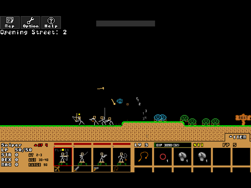 Stick Ranger is a party-style RPG made for people who don’t really want to do much work. The concept of Dan-Ball’s game is simple—progress through levels by getting from point A to point B and killing everything that stands in your way. The map is 2-D and the levels are small, so the game moves along quickly. Players start out by selecting their party. Four stickmen may join the party, and there are eight character classes to choose from. Some are ranged fighters, some are magic users, and some are warrior-types. After your party of four is selected, the adventuring begins.