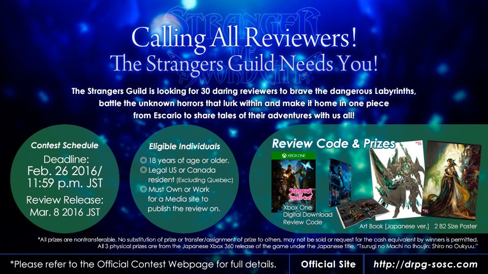 To enter, people must visit the Stranger of Sword City official website, meet the condition of having a site they either own or write for, read and agree to the contest rules, and then complete an entry form by February 26, 2016. Winners will be notified and sent the game by March 1, 2016. The review embargo will end on March 8, 2016, and they must be published by March 20, 2016. Reviews and sites will be featured on Experience’s website and Twitter account.