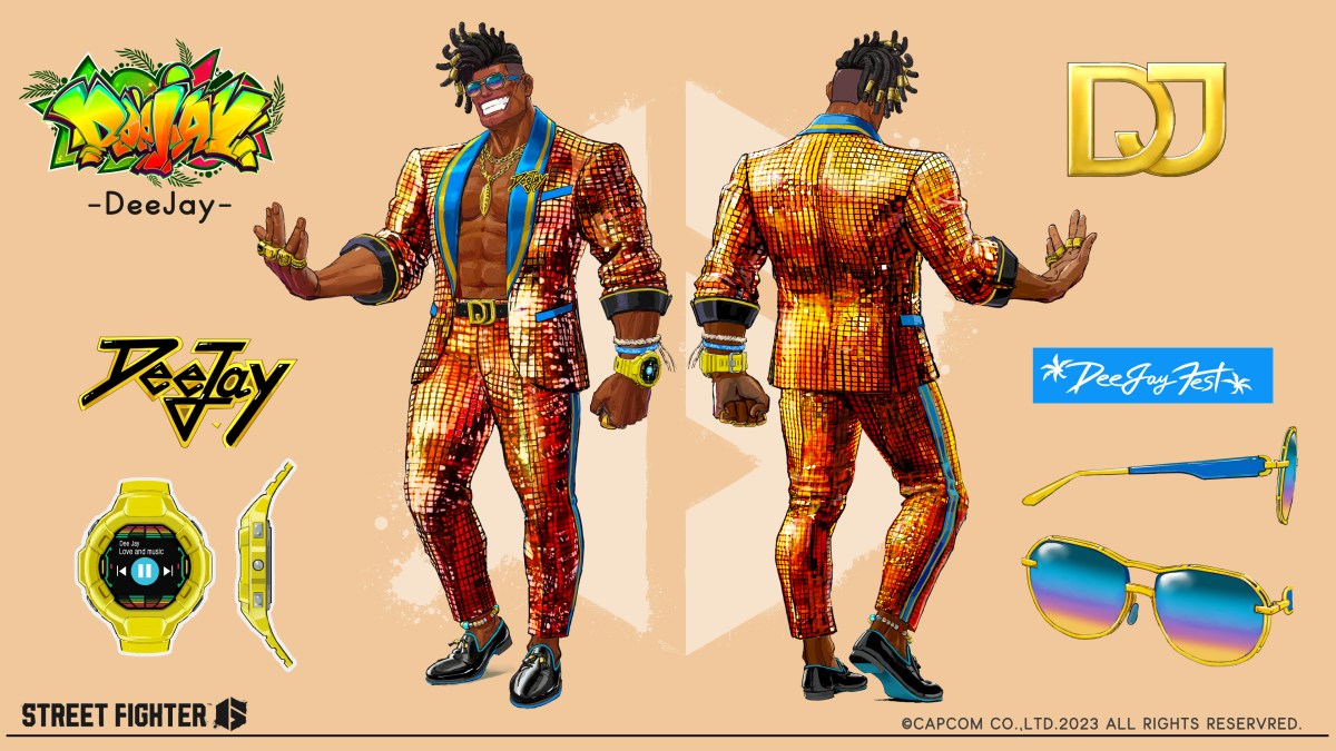 At Evo 2023, Capcom teased the upcoming Street Fighter 6 Outfit 3 costumes for Dee Jay, Guile, Juri, and Marisa. Concept art for all four appeared. Each one looks very different than their normal attire. For example, Juri is wearing a one-piece pajama in hers, while Marisa is wearing a wedding dress. There’s no release date for any of them yet, however. First, here’s Dee Jay’s Outfit 3. It’s a shiny gold suit that he wears with no shirt. He also has matching sunglasses and a smartwatch that is playing his own music.