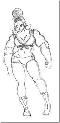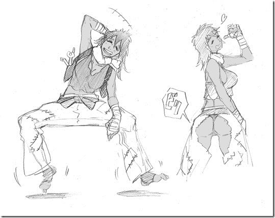 When this cutie starts fighting, her clothes start becoming more tattered due to her clumsiness. Uses tools when fighting. This idea came about when we were coming up for designs for Laura. Next!