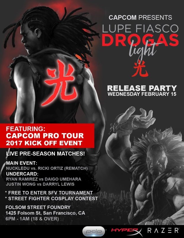 Over on their official blog, Capcom has announced that Street Fighter V’s second DLC character will soon be revealed during a launch party in San Francisco for Lupe Fiasco’s DROGAS Light album. Last year, at Street Fighter V’s launch party, Lupe challenged Daigo Umehara to an exhibition match at the Folsom Street Foundry in San Francisco. This year, to celebrate the release of Lupe’s album, a special event is being held at the same location. During the event, in addition to Season 2’s newest character being revealed, Capcom Pro Tour matches will be held featuring some of the game’s best players, as well as a cosplay contest. Lupe Fiasco’s album launch party will take place at Folsom Street Foundry on February 15th from 6 PM to 1 AM. You can read more about the event here.