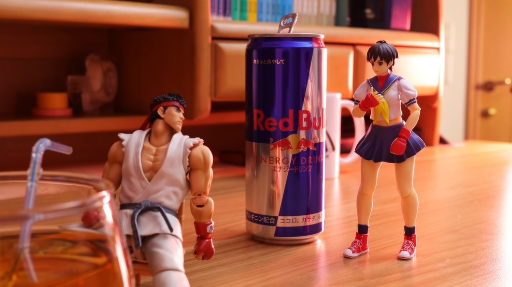 Here’s the uncut and original Street Fighter Sakura Ultra Combo video where she faces off against Ryu’s empty Red Bull can. She uses moves like Shunpukyaku and Shouoken to annihilate it. Here’s the making of video, where we see Animist examining the Sakura figure, taking photos, and animating the scene. In the step-by-step process, you can see where all of the stands were and the adjustments that would need to be made to ensure things looked smooth. It also shows the editing process, where elements like a fake UI are added and stands erased. Back in 2019, Animist also had a video of Ryu beating up a Red Bull can alone.