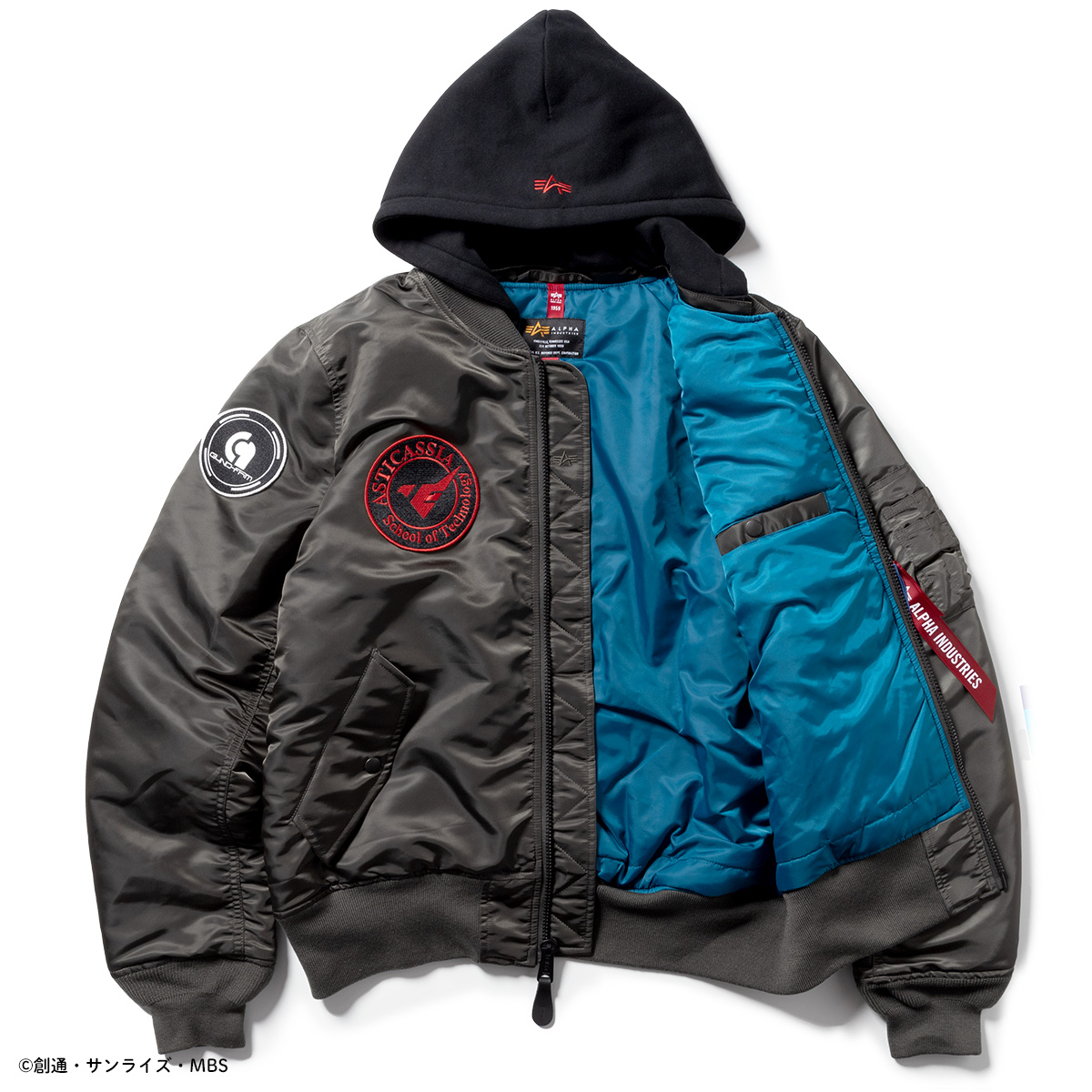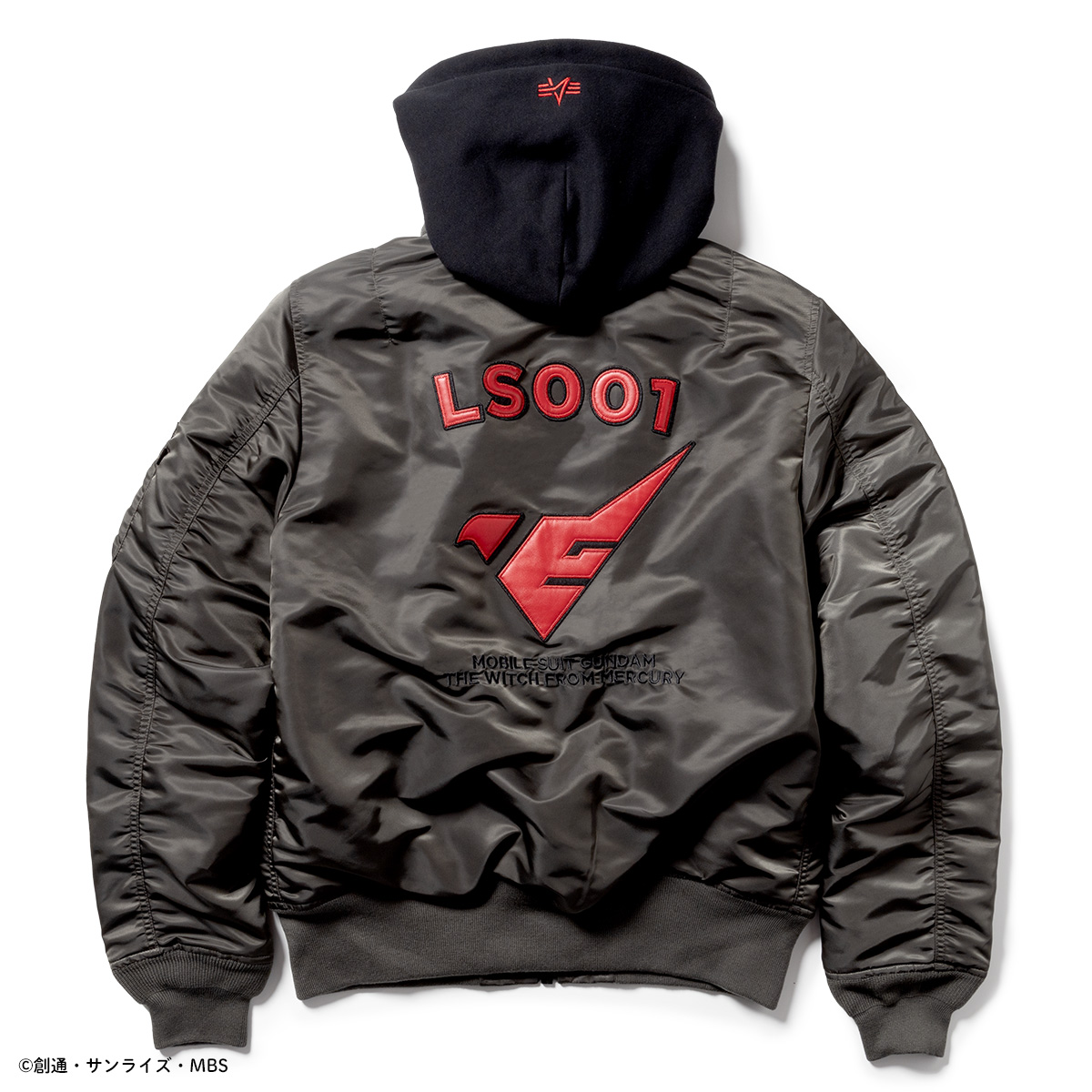 Meanwhile, the Mobile Suit Gundam: The Witch from Mercury Miorine jacket is dark green with the inner lining blue. This jacket features a hoodie, and the details are accented in red, like the LS001 student ID number on the back and the school logo on the right chest part. The Miorine jacket costs 46,200 yen (~$302.43.)