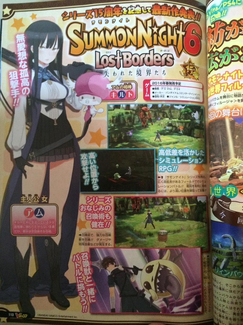 Bandai Namco have been teasing something special for the Summon Night series’ 15th anniversary on their official website, and the latest issue of V-Jump reveals the title as Summon Night 6: Lost Borders for PlayStation 4 and PlayStation Vita. [Thanks, Hachima.] In Summon Night 6, players will get to experience the game’s strategy RPG battles on vast fields with elevation differences. Getting up on higher areas will give players the strategic advantage. Similar to past Summon Night titles, you’ll get to summon out powerful summons to do massive damage and special effects to the enemies. Raj: The male protagonist of Summon Night 6 who lives in Filluja with his partner named Patch. He makes a living by gathering things that fall from the sky. Am: The female protagonist of Summon Night 6 who lives together with her partner Kilt. She’s one that doesn’t put much thought into things that aren’t important, but she’s a caring person. Here’s a bit of the story for Summon Night 6: One day, a meteor-like object falls into the “Cocoon World” of “Filluja,” where the protagonist lives. When Raj, the protagonist goes to check it out, it turns out that it was a creature that was summoned from a different world called Linbaum. During this time, Am, who lives further away, also meets a different summoned creature from Linbaum. Raj and Am have their own objectives, and together with their new friends from Linbaum, they’ll go on their journey to the threaded walls that surround the Cocoon World of Filluja. Summon Night 6 will release in Japan in spring 2016 for PlayStation 4 and PlayStation Vita.