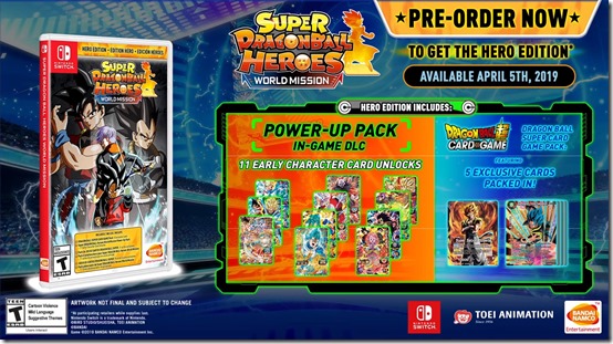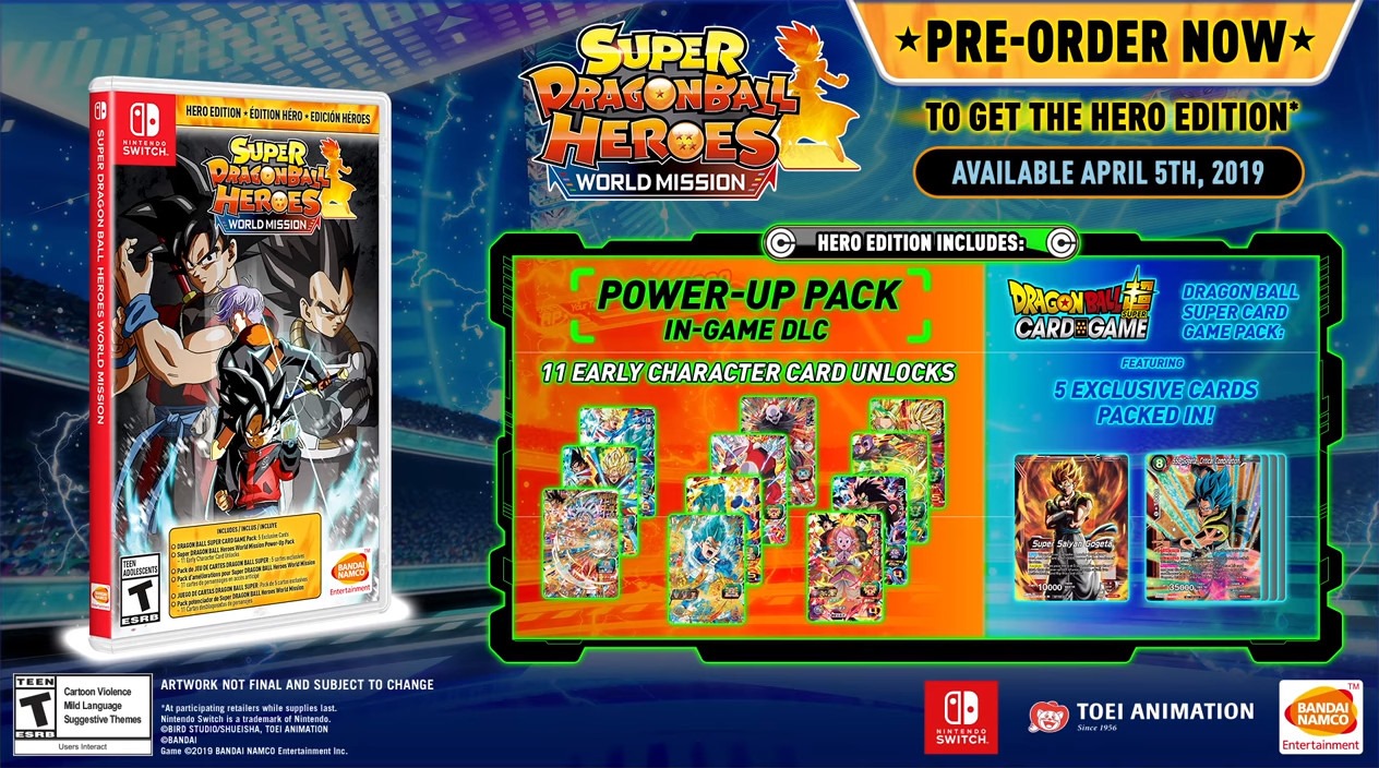 As for the Hero Edition, it comes with the “Power-Up Pack” DLC with 11 early character card unlocks. It also includes five exclusive cards from the Dragon Ball Super Card Game. Super Dragon Ball Heroes: World Mission releases for Nintendo Switch and PC in North America and Europe on April 5, 2019. It releases a day earlier, April 4, in Japan for Switch.