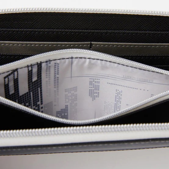 The watches feature unnumbered, analog displays with each character’s full name in Japanese displayed in hexadecimal code. Their “birthday,” or rather rollout date, is displayed at the bottom of the watch. 2B’s bag has a backpack design with embossed sides and more hexadecimal phrases printed on the inside, while 9S’s is a crossbody bag modeled after the one he wears on his back. Each of the bags and wallets have designs on the interior referencing various symbols from the NieR universe, like 9S’s hacking or images from the opening to the anime adaptation.