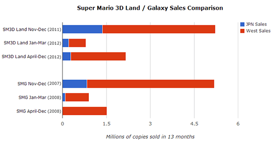 As shown in the graph above, over the course of thirteen months, significantly greater sales of Super Mario 3D Land in Japan (blue bars) helped the game outpace Galaxy’s worldwide sales. Super Mario 3D Land sold 1.85 million copies in Japan alone, while Galaxy sales in Japan were at 934,000. If you’re more interested in exact sales figures of both games in Japan and the West, you can find them at the bottom of this report. So, why is Super Mario 3D Land doing so much better than Galaxy in Japan? It’s because 3D Mario games tend not to do as well in Japan as they do in the west, but 3D Land is a deliberate mix of the linear 2D and more exploratory 3D styles, which makes it more approachable for the Japanese audience. As of March 2012—ie; five years after its release—worldwide Super Mario Galaxy sales were at 10.68 million copies. It should be interesting to see how high Super Mario 3D Land goes in a similar timeframe, especially since it already has New Super Mario Bros. 2 stealing some of its thunder, particularly in the Japanese market.