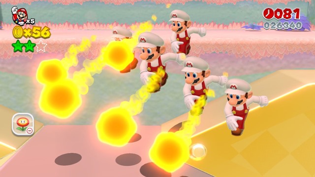 This particular stage was also chock full of enemies, so having backup was definitely handy. When you shoot a fireball, everyone shoots a fireball. On that note, and I could be wrong, but Double Cherries are the only power up I can think of, from all the other Super Mario games, that augment a special ability instead of replacing it. So, if you get Fire Flower, all your clones reap the same benefit; they don’t immediately disappear, as one might have guessed. I asked what the maximum amount of clones on screen was, and was told by the demo person that he didn’t know. No limit had been reached, and noted that when there are four players on screen, and if each person has a clone, it’s total calamity. Unfortunately, clones are only specific to whatever level Double Cherries appear. When one completes that stage and moves onto another, the clones do not carry over. Also, as noted, it is possible for clones to become separated, especially during multiplayer, but I was not able to see firsthand what happens if one straggles too far behind. Nor was I able to see what happens when a clone becomes in contact with an enemy, to see if they all take a hit or if just the one dies. This much is certain, however: the game is fully loaded with nods to past Super Mario games. There’s always been a certain degree of fan service, but I was quite pleased to see the types of Goombas from the original Super Mario World roaming around, alongside the sleeker, less plump version that we’re all used to. There’s also hidden path in the aforementioned shadow level that has a Toadstool brethren scared to death by Koopa. Or at least it looks like him—or his shadow. But in fact, it’s just a paper cut out, the same kind seen in Paper Mario. We’ll all have to wait and see if every single past Mario game gets some sort of nod when Super Mario 3D World launches on November 22.