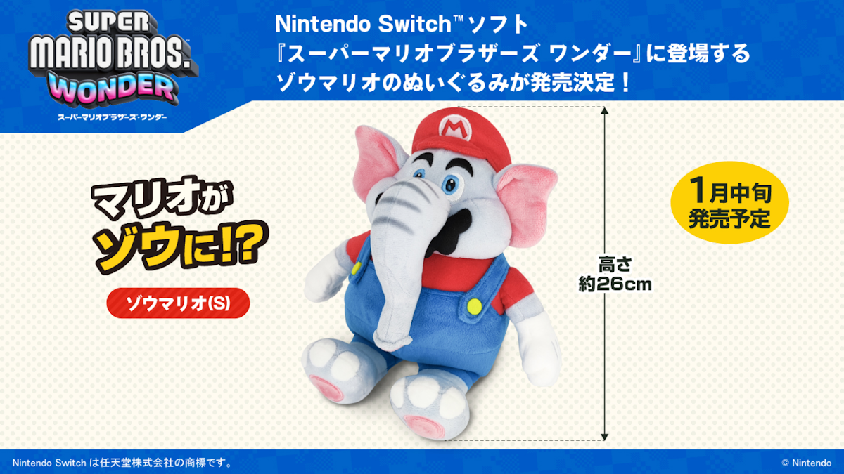 The Elephant Mario plush by Sanei Boeki will be available in Japanese retail stores beginning in mid-January 2024 for the price of 3,300 yen ($22.04). Super Mario Bros Wonder is available now on the Nintendo Switch.