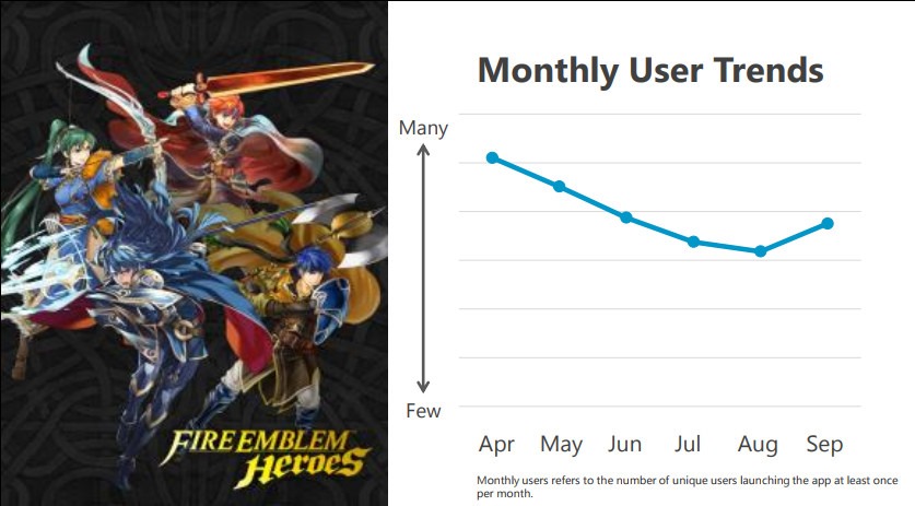 We will continue on to Fire Emblem Heroes, released in February of this year. For this title, we listened to the voices of our consumers and provided continual updates. As the result, we are on track to meet our overall business objectives, including our profit objectives. Since this summer, we have been holding large-scale events, adding new characters, adjusting specifications, and running new promotional campaigns, all bringing about another increase in active users
