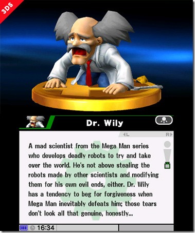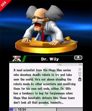 Mega Man’s Dr. Wily is one of the trophies in Super Smash Bros., director Masahiro Sakurai revealed over Miiverse last night. In fact, Sakurai said, the number of trophies in the new game is seeing an increase over Super Smash Bros. Brawl. “You can rotate the trophies by drawing circles on the bottom screen,” Sakurai wrote on Miiverse. “Super Smash Bros. Brawl had tons of trophies, but rumor has it that the 3DS version alone may have more than Brawl. Looks like the Dr. Wily that we made from scratch for the 3DS version is on his knees in disbelief.” Sakurai added in a follow-up comment: “Here’s something new—the trophy shop. If you’re having a hard time getting certain trophies, why not just buy them? They sometimes go on sale, too.” ![]()