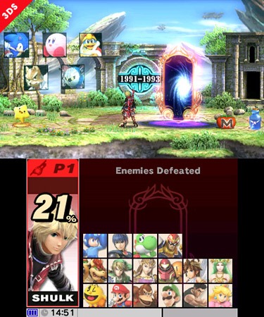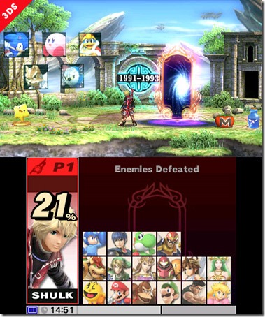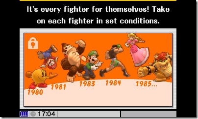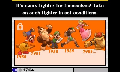 “In these battles, multiple opponents appear in one stage, and you clear the battle by defeating a number of them,” Sakurai explained. “The rest area that appears between battles displays the next opponents and the year the characters made their first appearances, and it also holds recovery items and an occasional reward.” “The characters you fight against appear pretty much in chronological order. Behold, the history of Nintendo games!!”