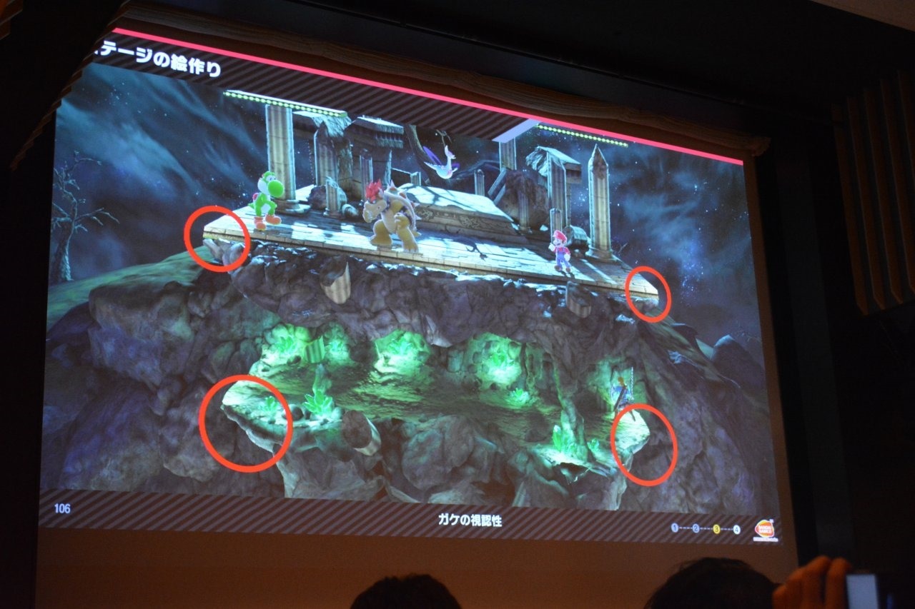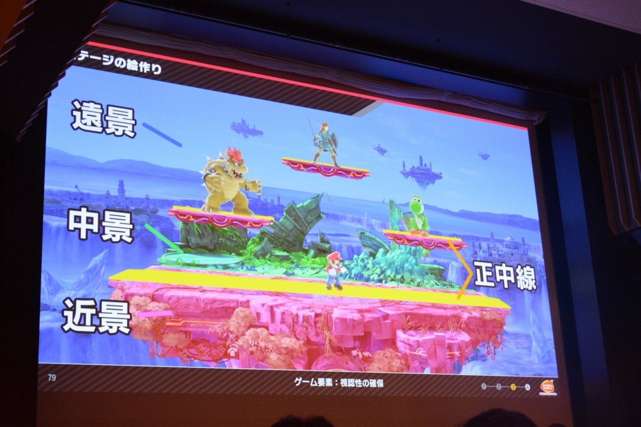 Stages in Smash Bros. Ultimate are divided into the foreground, midground, and background. The closer to the screen they are, the more focus they get, and places where characters stand are shown as “central lines”. Sometimes, objects are shown behind the central lines, making it hard to tell where the platform is. To emphasize the areas characters can stand, the developers added lights and other ways to highlight the platforms and especially the edges that could be grabbed, even if the lighting was unnatural.