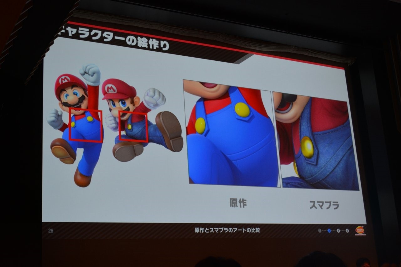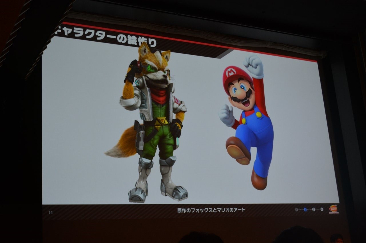 For Fox, they focused on making his silhouette more distinct, and reduced the shadows and fur detail. Meanwhile, Mario received more realistic-looking overalls, and a less bright color scheme.