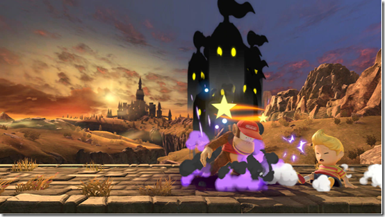 A stage based on Green Greens from Kirby’s Dream Land. Whispy Woods (the tree in the center) blows wind to the sides. You can eat the apples it drops to recover health! Or you can just pick them up and throw them at your opponents.