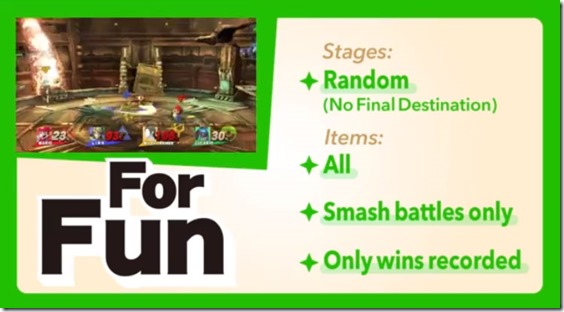 For Fun mode will select stages at random, will enable all items, and will only record the number of times you’ve won matches. In this mode, only Smash Battles are possible.