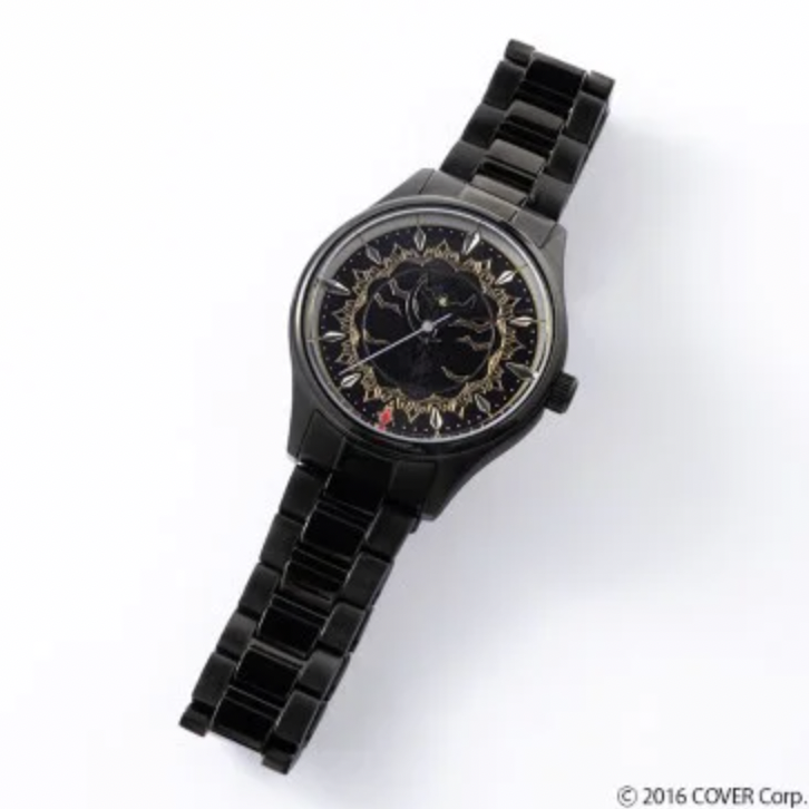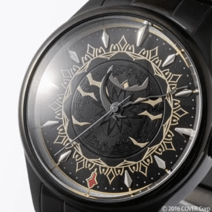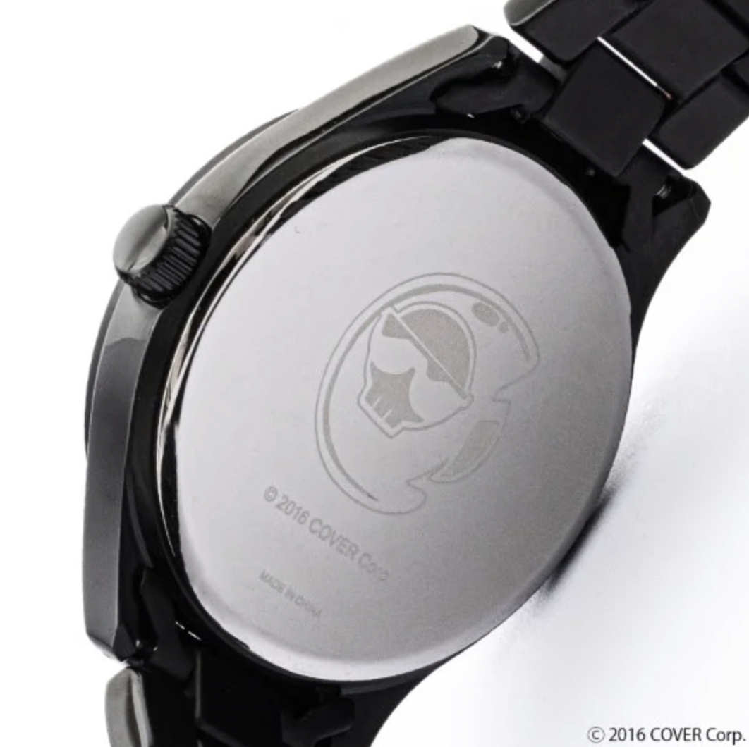 The Calliope Mori watch costs ¥27,500 (~$174) and is the most expensive item in the collection. It features a tiara and corset bones design on the face, a scythe as the hour hand, and a Dead Beat icon on the back.